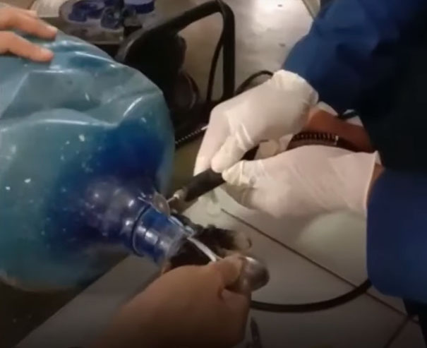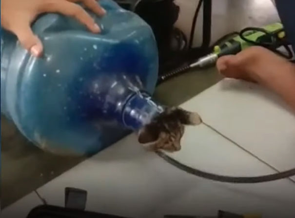 The kitten was given to it’s initial rescuers who were thrilled to take it home. Going forward ideally, water jugs are filled with water ONLY!