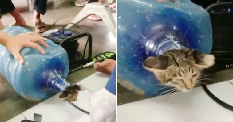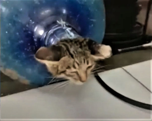 It just so happened the kitten was discovered with it’s HEAD sticking out of the water jug!