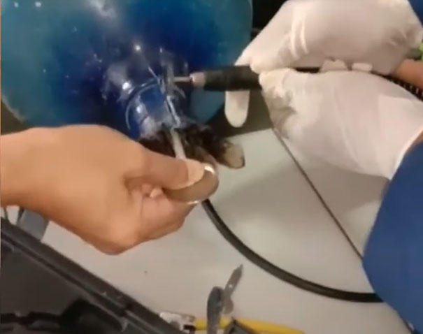 With baited breath, the team used a tiny circular saw to cut the thick plastic water jug.