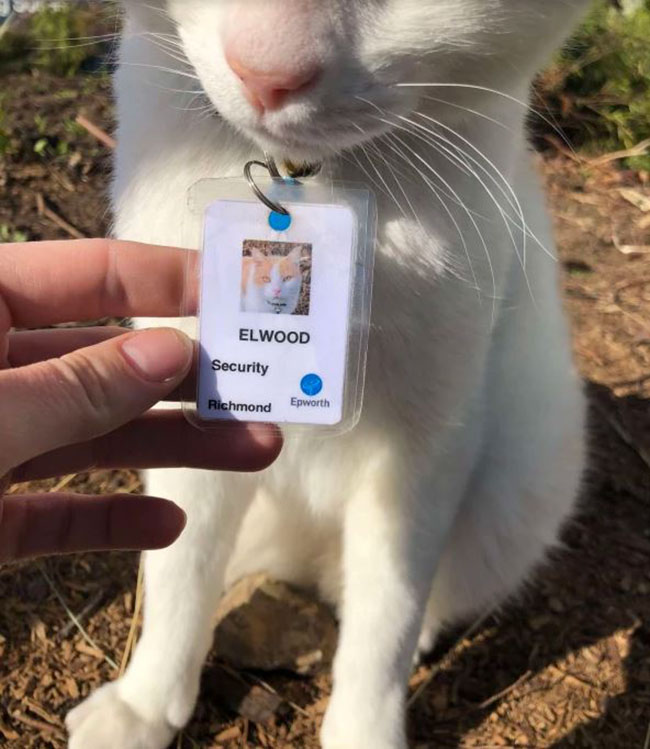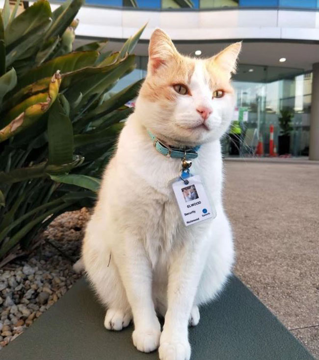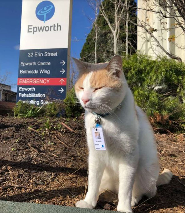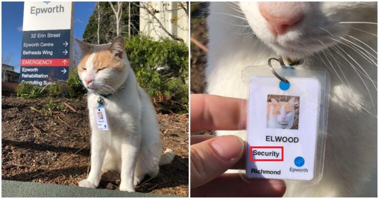 This catto is named Elwood. He’s a security guard at the Epworth Healthcare hospital in Richmond, Australia. No one knew who he was and what he did before this, but the only thing everyone knows is that Elwood takes his job very seriously.
