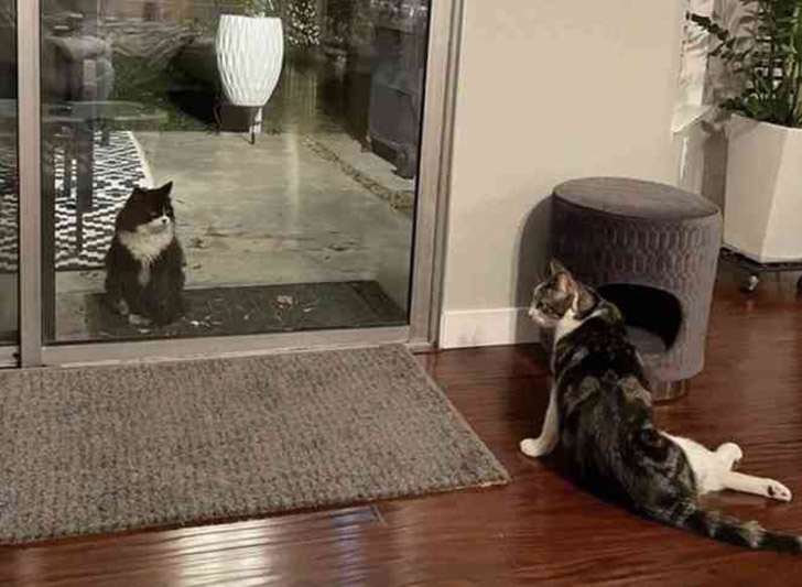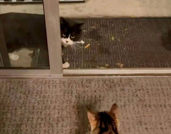 Then one day a lonely Tuxedo cat, whom she nicknamed Buddy, started showing up in her backyard. He was watching the kittens inside her home as if he was longing to have some playmates of his own.