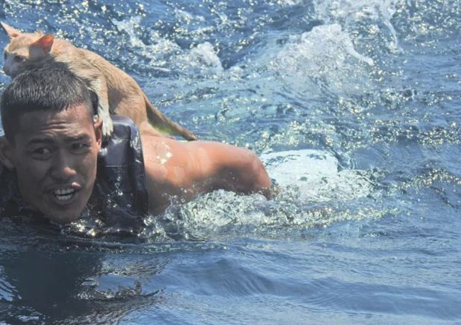 Without thinking much, the brave Navy officers jumped into the water, carried each cat on their backs and swam back to the Navy vessel until every cat was rescued.