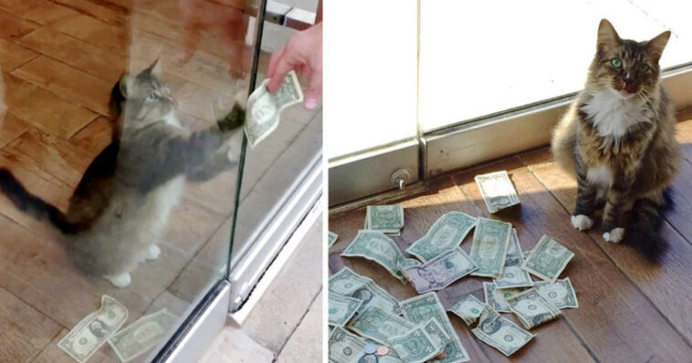 Anybody who thinks cats are lazy clearly haven’t met Sir Whines-A-Lot, because this kitty keeps himself super busy…stealing other people’s cash!