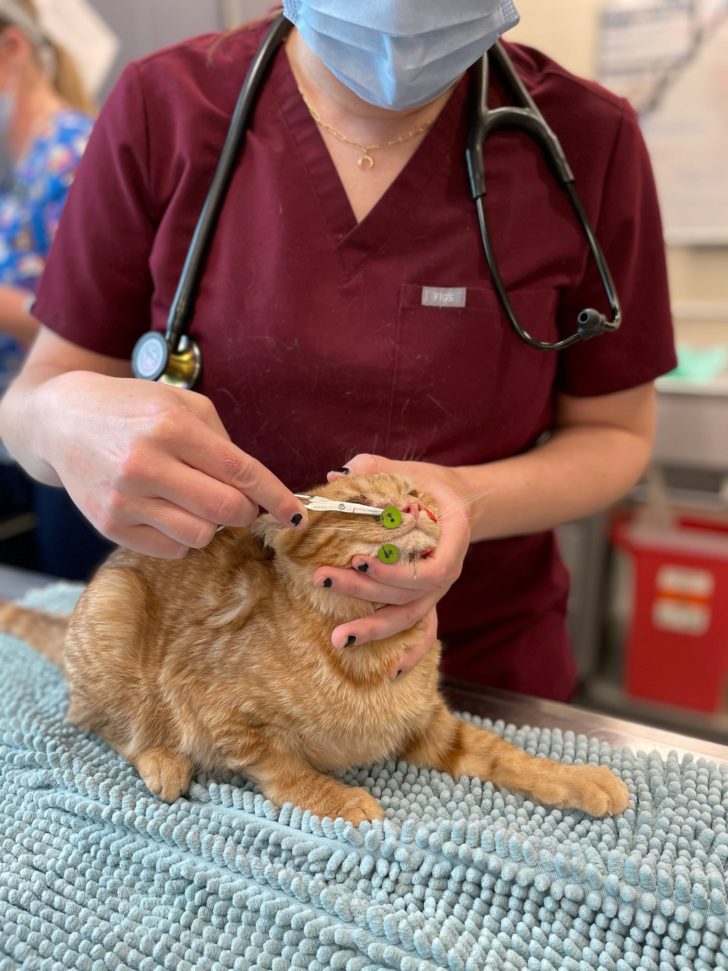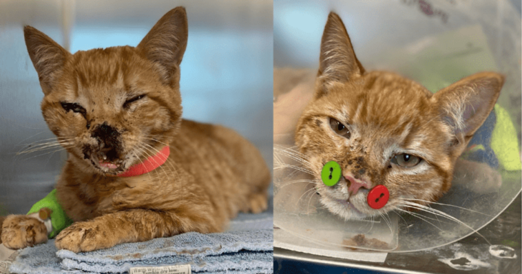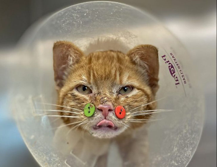 Juicebox was brought to Angell Animal Medical Center in Boston after playtime with his canine sibling got out of hand. The kitten had a broken jaw as well as serious facial lacerations, which the veterinarians at Angell repaired in a remarkably original way, using four colorful buttons.