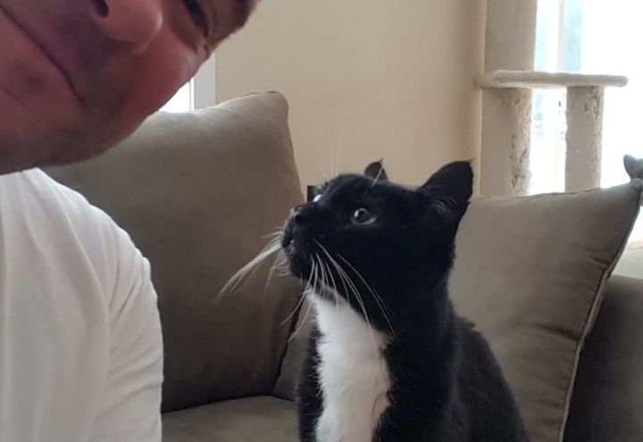 Upon arrival, he saw Sammy sitting alone at the adoption center, looking a bit bleak. When he walked up to Sammy, the tuxedo perked up and took quite a liking to him.