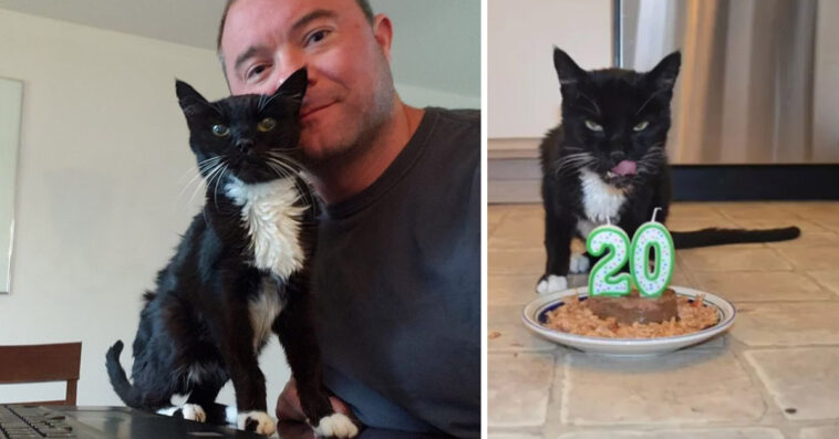 The pretty cat just turned 20 years old this May. Tim celebrated this incredible milestone with his best friend by making him a cake filled with his favorite cat food and treats.