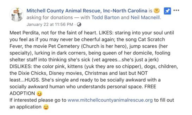 The creative ad has since gained so much attention, there are currently 50 applicants who are eager to adopt Perdita. We do feel that Perdita is grumpy because she is coping with the death of her owner. Hopefully her new owner will prove to her that there is still love in the world and Perdita will once again be a cheerful loving cat.