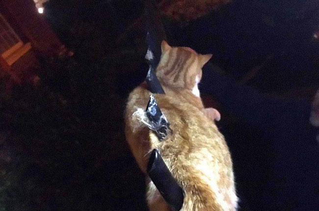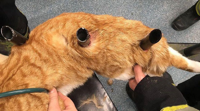 They cut through the metal railings in the hopes that the cat can survive the horrendous ordeal.