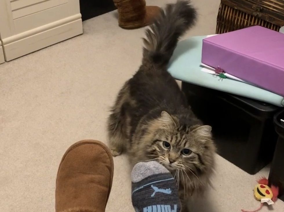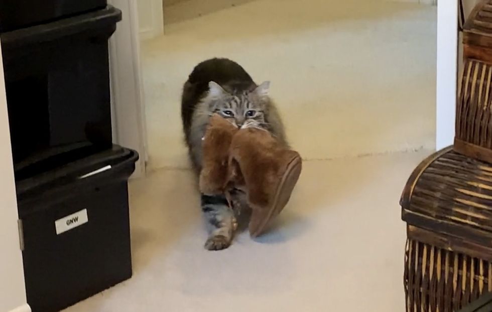 She makes two trips to ensure that both slippers are safely delivered. Nothing will stop her, not even the stairs…
