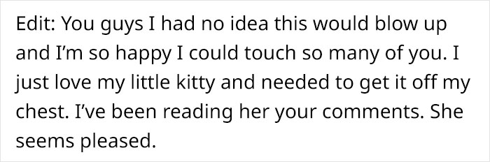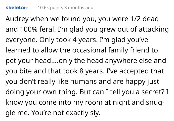 So beyond a good cuddle, our cat feelings go largely unsaid. Not anymore! Reddit user skeletoorr decided to write an open letter to their ‘sly’ cat called Audrey, and it went crazy viral for its sweet and simple message.