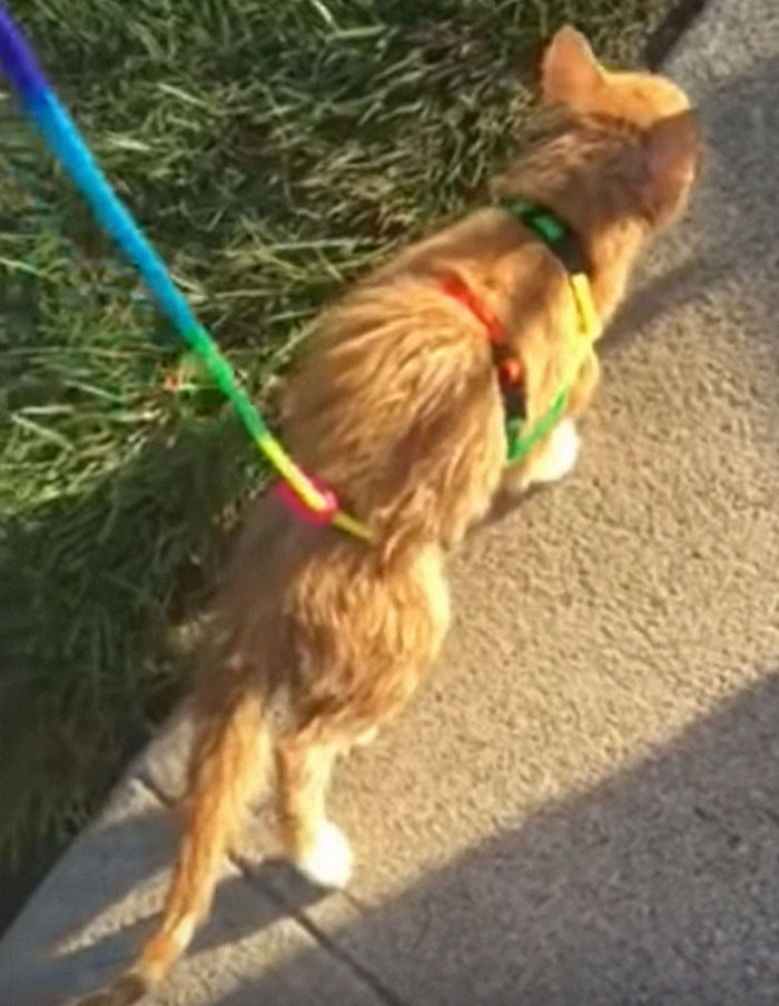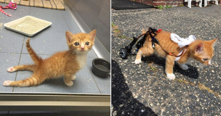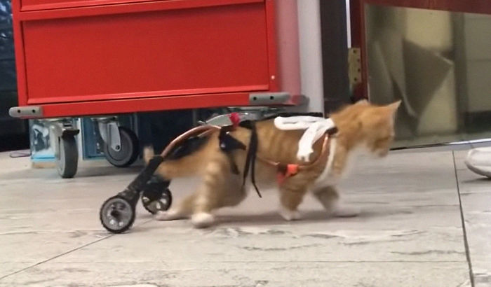 In 2016, a video of Mac ‘n’ Cheez, a tiny kitten with paralyzed back legs, using a tiny “wheelchair” to test out his full zooming potential went viral. Since then, the handsome ginger cat has learned how to get around on two legs, with or without a harness or wheels.