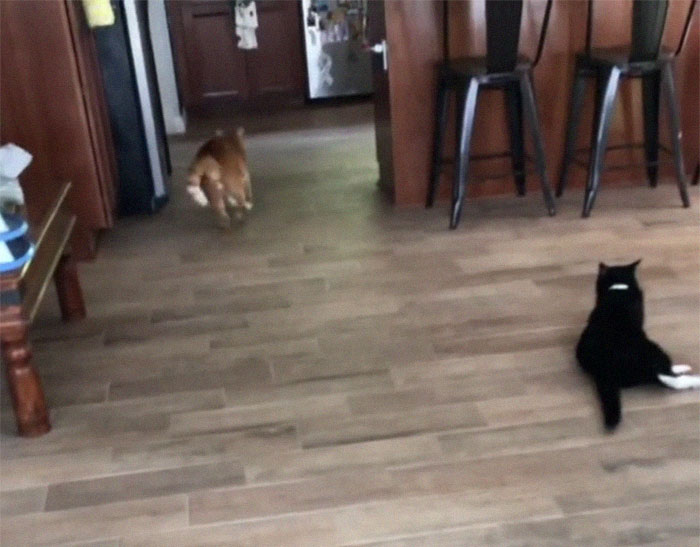 When they were taking what seemed to be just another video of the feline, Gambino ran across the room, hiding in a corner. Not to be outdone, its human went after it. A few seconds later, they caught up to the little critter. It raised its head and somehow meowed a “Well, Hi!” in a Southern accent. And proceeded to nonchalantly groom itself.