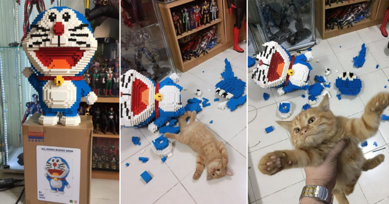 One mischievous cat found a powerful way to get its owner’s attention: it wrecked a large, 2,432-piece figure of Doraemon. Well, the man from Thailand who works at a toy store spent a whole week building the figure for a client, so all of that hard work suddenly went out the window.