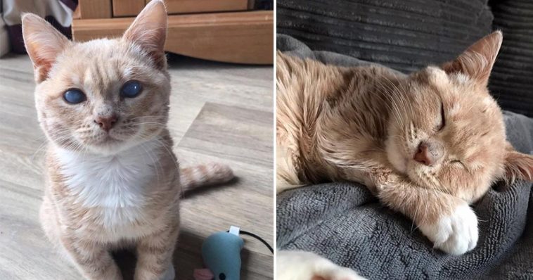 “So, I work in a veterinary practice. He got handed in at practice after being found by a lady near to a park. I fostered him for a week, then adopted him when no one came forward to claim him. The cute kitten already had bilateral corneal edema, which is his cloudy eyes, but this does not affect his everyday life and he knows no different. This was the beginning of September 2019 and he was suspected by the vets to be 3-4 weeks of age,” Emily told us.