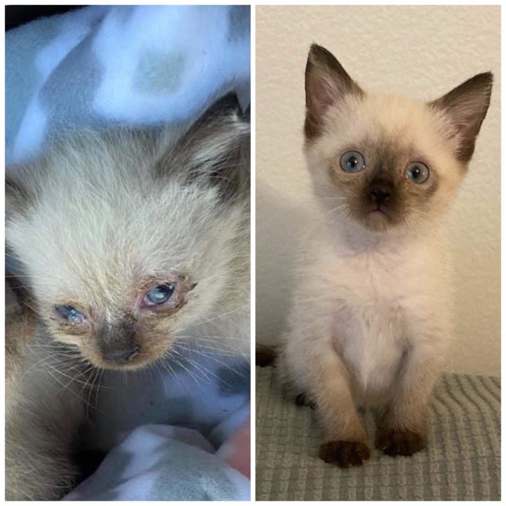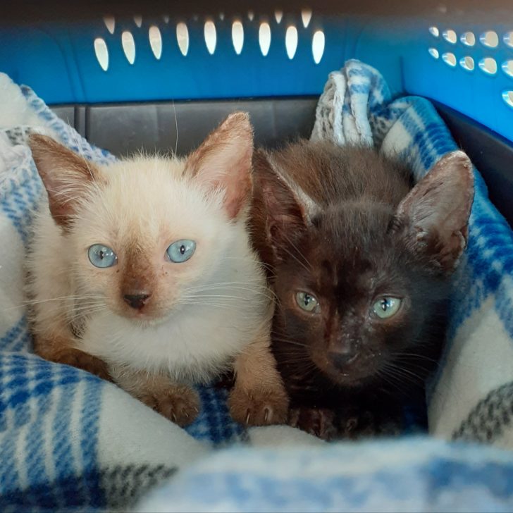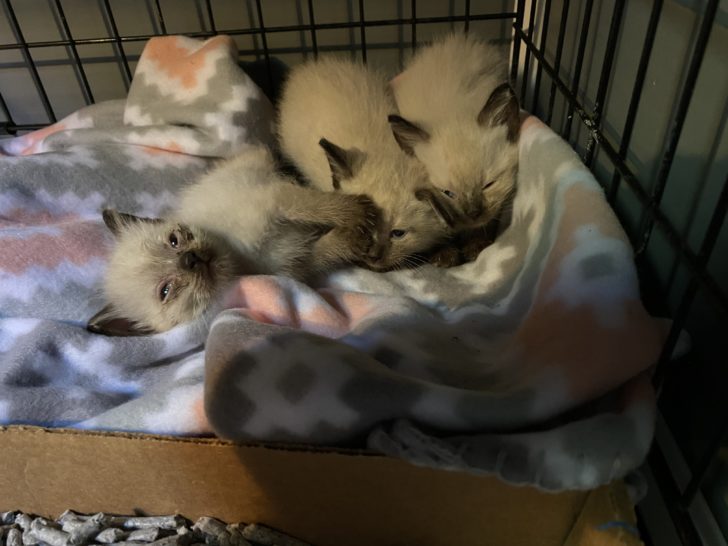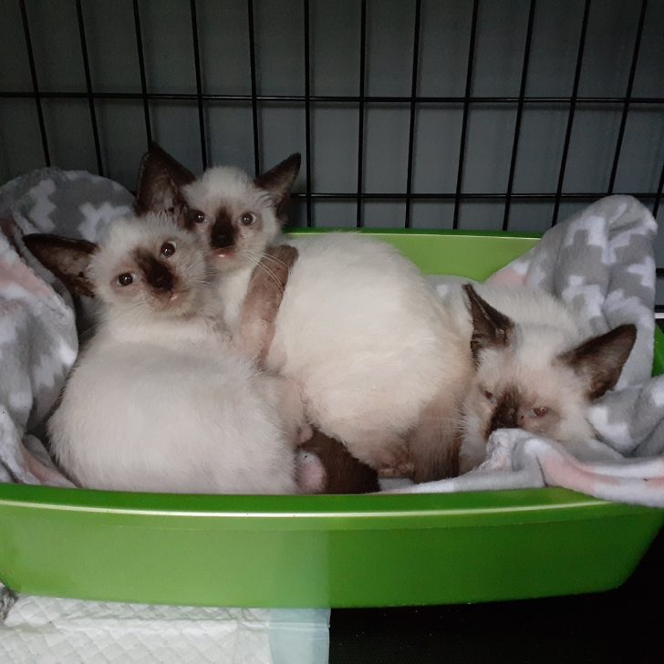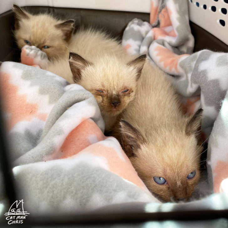 The cats on “Siamese Street” as Chris began referring to it, were suffering though. And as he was able to coax them near him, he noticed they definitely needed medical attention. As with most stray and feral felines, they were fighting fleas and had goopy eyes from infections. Many of the first kittens caught had mange beginning to show on their tiny bodies. Later, in foster care, the dreaded ringworm made an appearance as well.