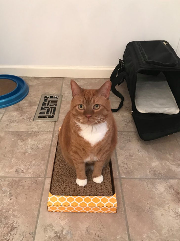 “We let him out of the carrier, and he is just all over us. He was just a purring machine, rubbing up against us. And we laughed because he was even purring while he was using his litter box and drinking water. I think he knew that he was home and was just so happy,” James said.