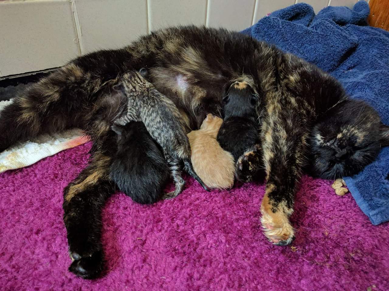 And right when she thought the struggle was finally over, two hours later, the tortie mama welcomed her last baby – a tabby boy.
