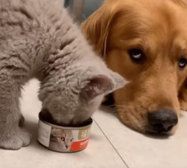 The dog relaxes by its side while the kitten enjoys its tasty wet food. “He almost looks up at the camera with an expression that says comically, “Will you not allow an animal to eat in peace?