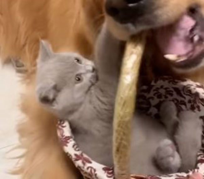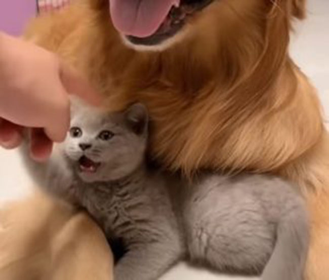 For their joyful spirits, Golden Retrievers are renowned, and it seems that the dog has been turned back into a happy camper! The two of them play for a while and the feline ends up sitting between the front legs of the pooch. Can you say abundance of cuteness?