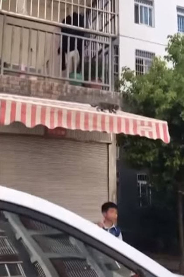 On the way home from school, two primary school students see a cat trapped on a canopy. The two boys realize they need to act quickly before the kitten falls from the canopy.