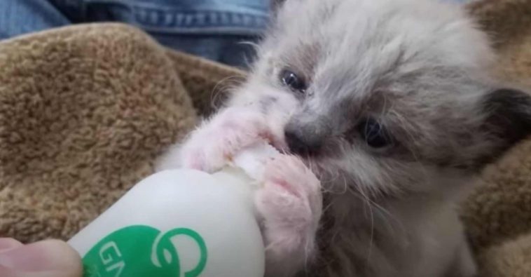 They quickly went to the store to get supplies and kitten formula so that they could start feeding him and after a full meal the tiny kitten quickly fell asleep, contented with his full belly.