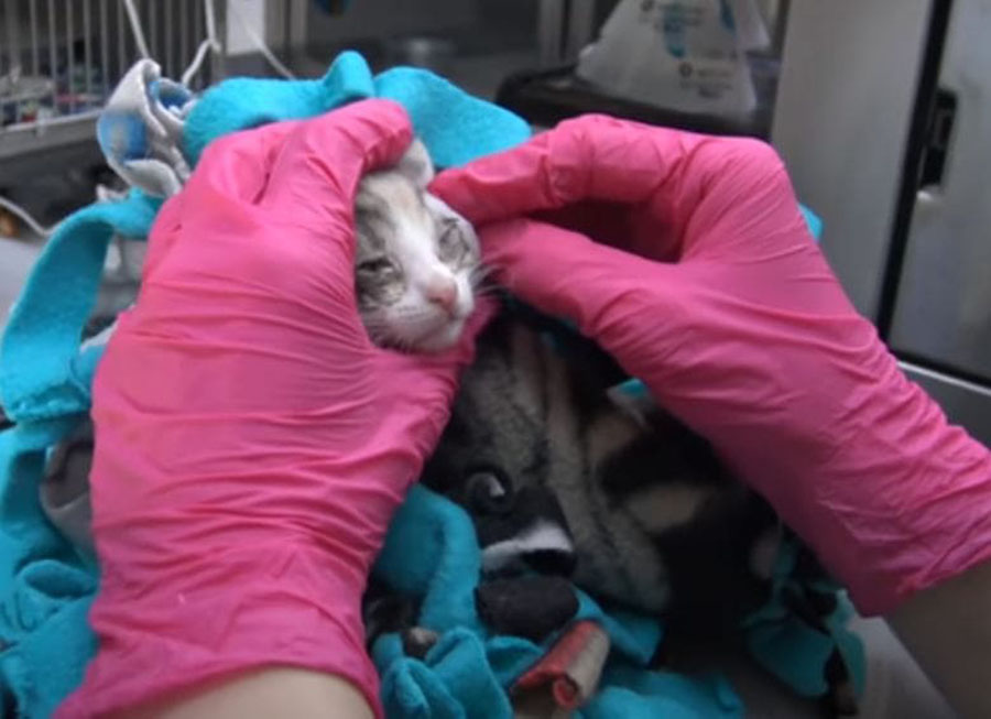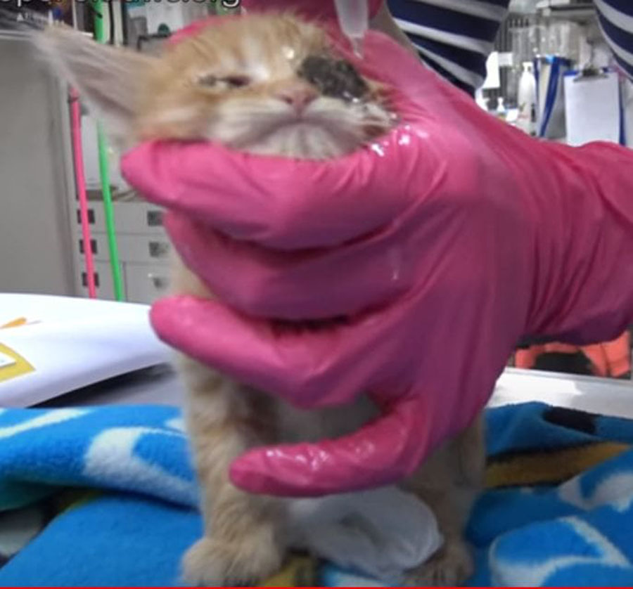 It was a kitten that has the same color fur as the mother cat. Her abnormally enlarged abdomen showed signs of worms. The second kitten, unfortunately, had an infected eye. The next one also had problems with the skin and his eyes were full of gums. The cat that was finally rescued was also the worst, with the entire left eye with pus and mud. They were told that there were 4 kittens but they checked again to ensure no cat would be left. After that, they quickly took the family of cats to the hospital for health checks and treatments.