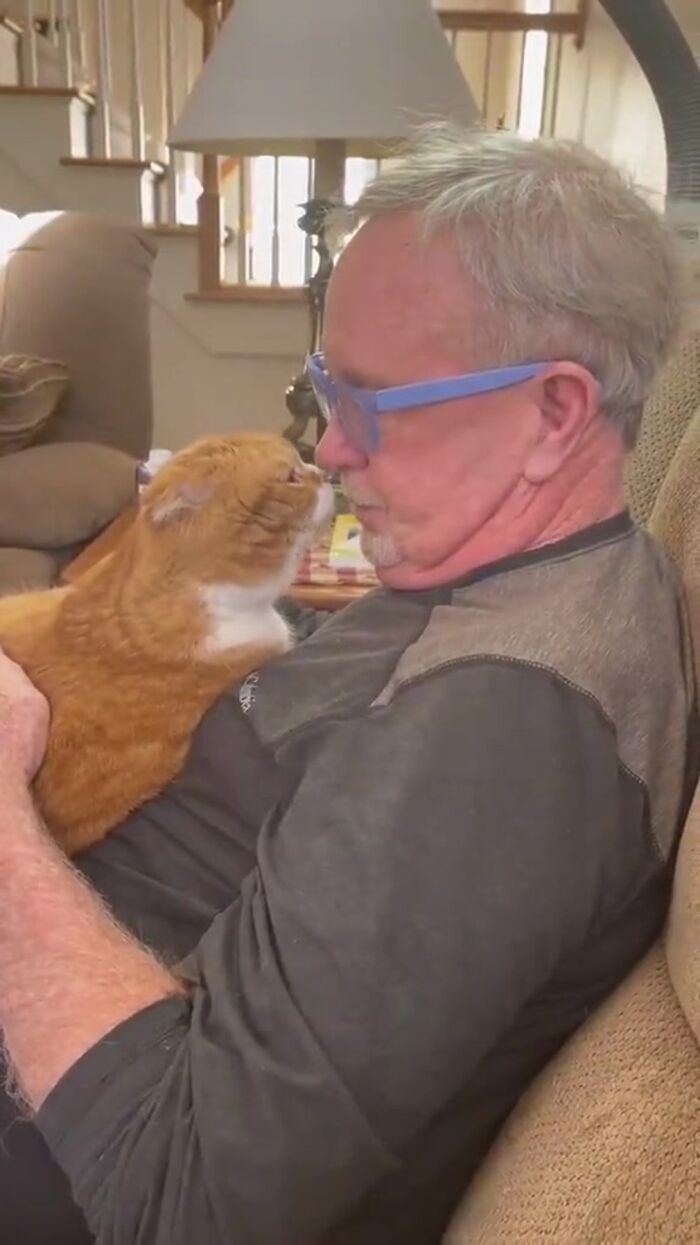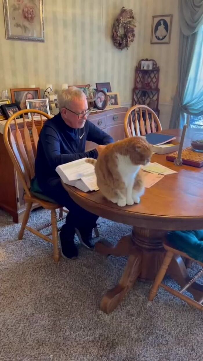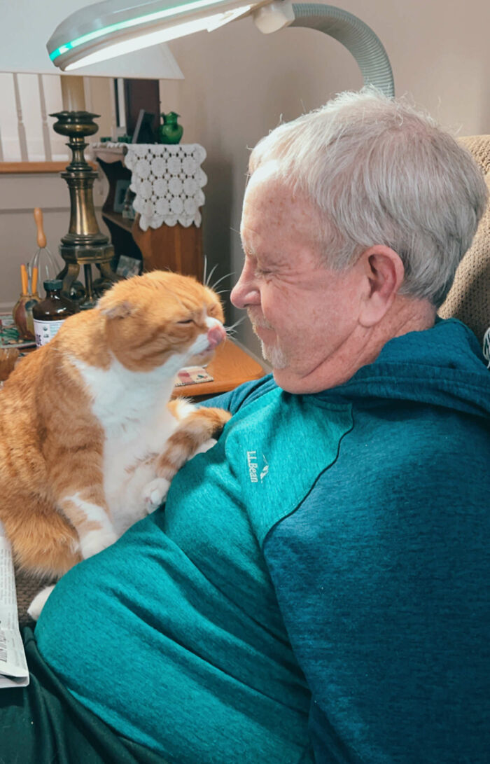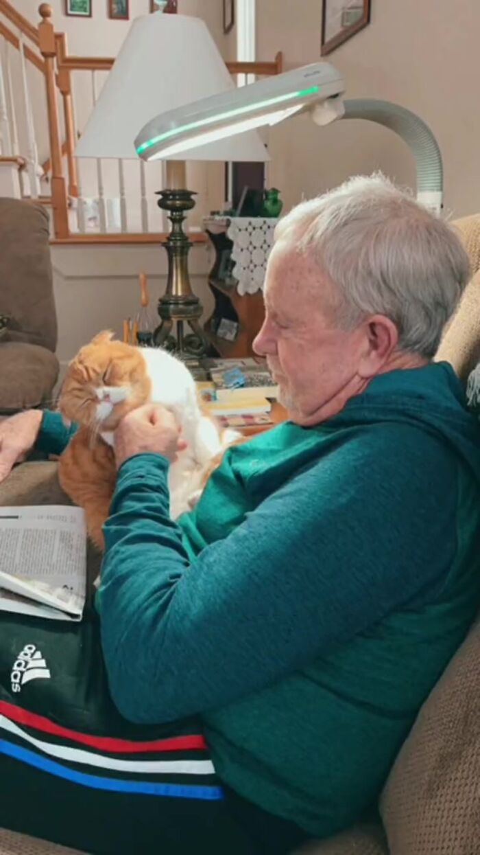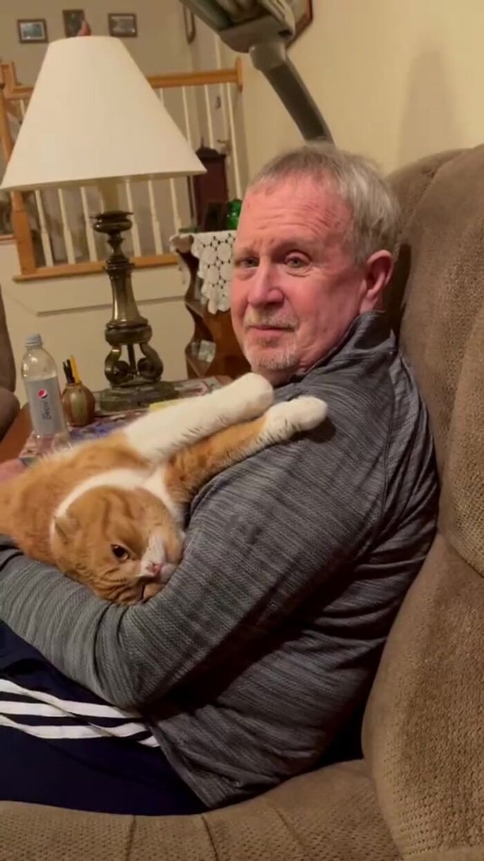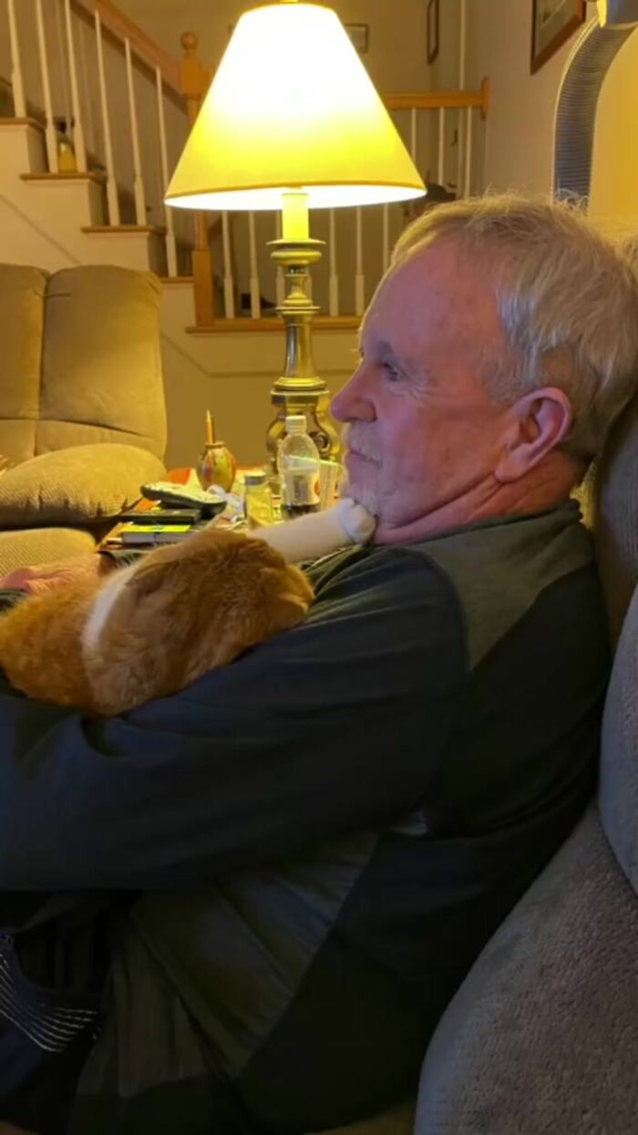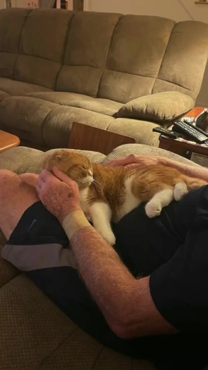“So my dad has a recliner that he sits in and he’ll put his arm on the recliner, and every single time, without fail, Sweet Potato will jump up and sit in the little cove in his arm and cuddle with him. He’ll sleep in his bed or in his room. Whenever my dad’s on the computer, [Sweet Potato will] jump on his keyboard. Whenever my dad is sitting at the table to do some of his paperwork, Sweet Potato will sit on the paperwork. He just has to be on top of him,” Nugent told The Dodo.
