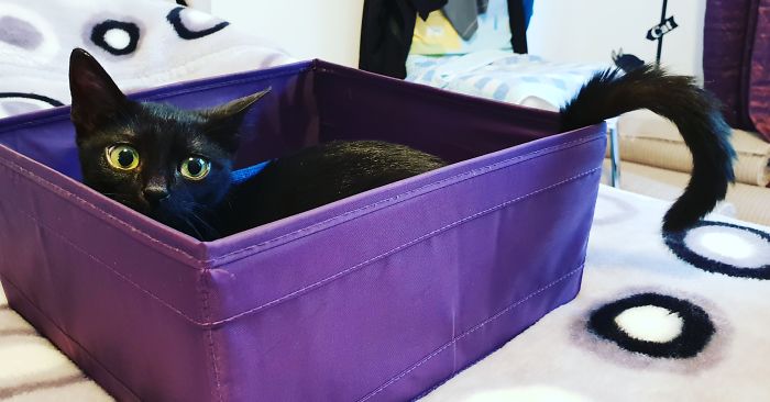 Last year in May, I decided it was time we adopt a cat, I convinced my husband and started to look for a kitten. I really wanted to adopt a black cat because I know they are the last to get adopted. We found an add online with the last black kitten from its litter and we decided that was it – we’ve found what we wanted. We picked her up late one night from her owner and brought her home. She was a scrawny little fur ball with cloudy green eyes. She was so tiny she could fit in one hand.