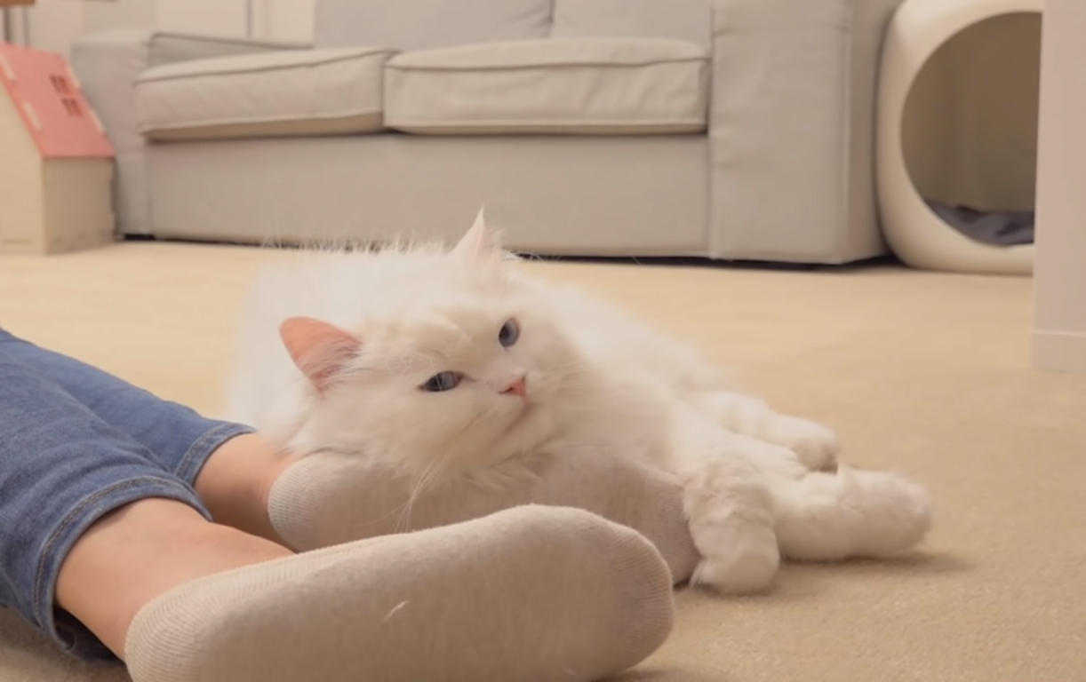 Some of the cats are curious at first, they approach Claire to see what’s going on. However, the care didn’t last long though. Later, one of them starts to chew her hair and refuses to let go, another takes a good nap right on the poor girl, another uses her foot as a pillow, while the rest are just too busy with their own stuff to bother.