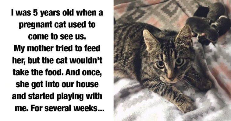 I was 5 years old when a pregnant cat used to come to see us. My mother tried to feed her, but the cat wouldn’t take the food. And once, she got into our house and started playing with me. For several weeks, she’d play with me and leave. Then she disappeared for a while and returned with a black kitten. For several weeks, she came to us every day and taught the kitten to be a cat. And then she stopped coming when she realized we could feed him. Later, we found out that she gave out 4 more kittens to other families with children in our apartment building.