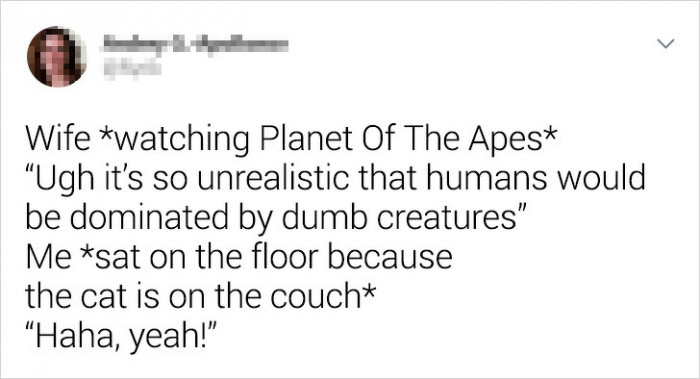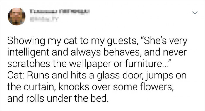 My husband continues the session, “Can you consider the possibility of this happening and the cat’s skills?”