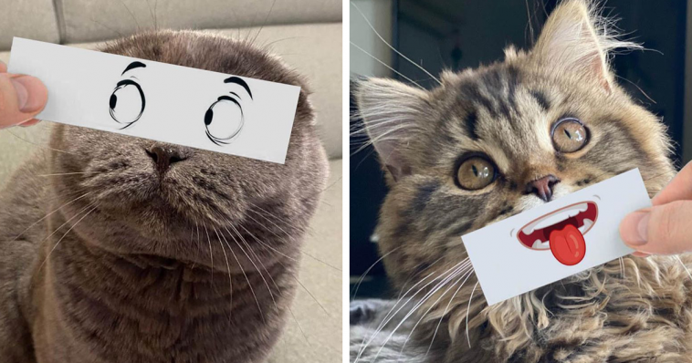 Consider Adrian and his dear cats Atlas and CleoCatra, for example. Although they have their own Instagram where the two of them show every day that there is a lot of fun to be had as cats, their fellow humans have fun with them too, like taking a picture of one hand with a piece of paper that has a part of a facial expression to make it look like a silly picture of the cats making faces.