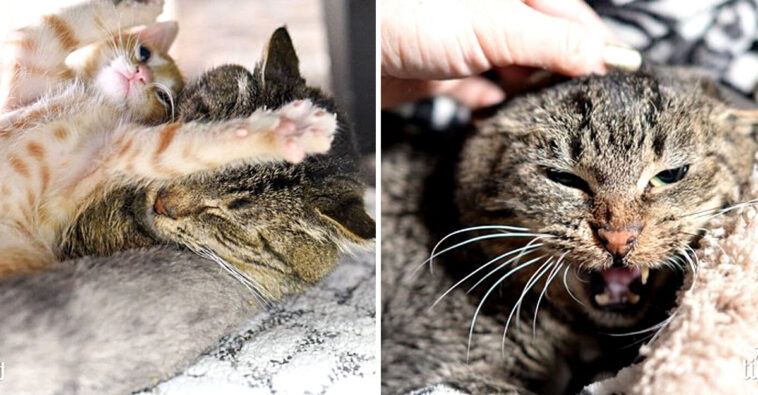 He is a ten-year-old stray cat. Aggressive, moody and grumpy, he didn’t let himself be touched and hated contact. However, that is a thing of the past. He met a couple of kittens and became their adoptive father. He discovered love and lived happily ever after with his new family.