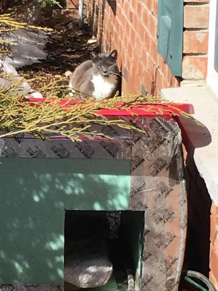 But because it was winter, I couldn’t bear to think that it didn’t have a warm place to sleep. So, we put together another house in the front yard out of a plastic storage container, insulation and yes, another heated pad. We did this so it could eat in warmth (backyard) and sleep in warmth (front yard).