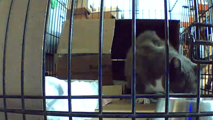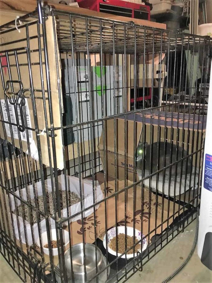 We were able to borrow a large dog cage from a neighbor, and we set up her temporary home in our garage. We were able to put a box in the cage and put her heating pad in that box. This way, she had a sheltered bed, just like outside. To our surprise, the minute we put her in the cage, she walked right over to her heated pad, stopped crying and slept for hours. She was exhausted! Later that day, she came out to eat, drink, and use the litter box.