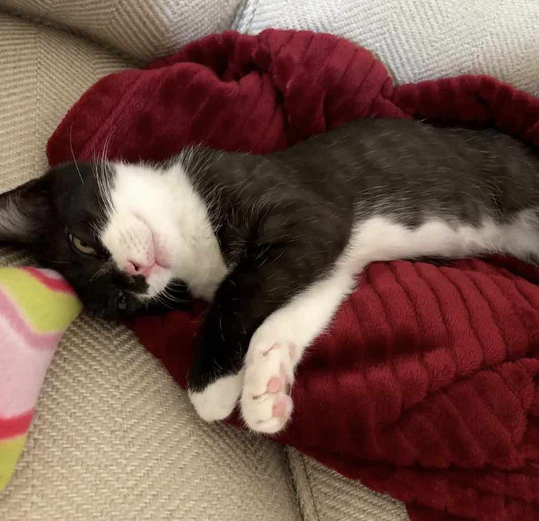 The kitten who was found on the streets, alone and scared, is now a full-time lap cat.