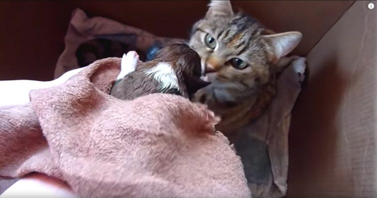 This might be one of the happiest moments of this family when their dog and their cat gave birth at almost the same time, only the dog was a little bit later. And because of curiosity, they suddenly came up with the idea of showing their tabby a newborn puppy to see how she would react. This action was not recommended as the cat could purposely hurt the pup, but it seemed like they knew their kitty and they were sure such a thing wouldn’t happen. And thankfully, they were right.