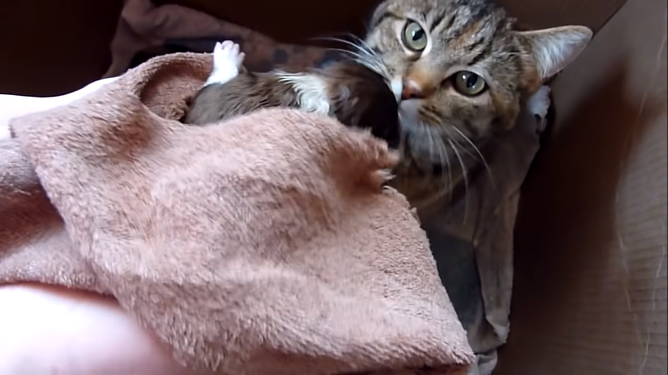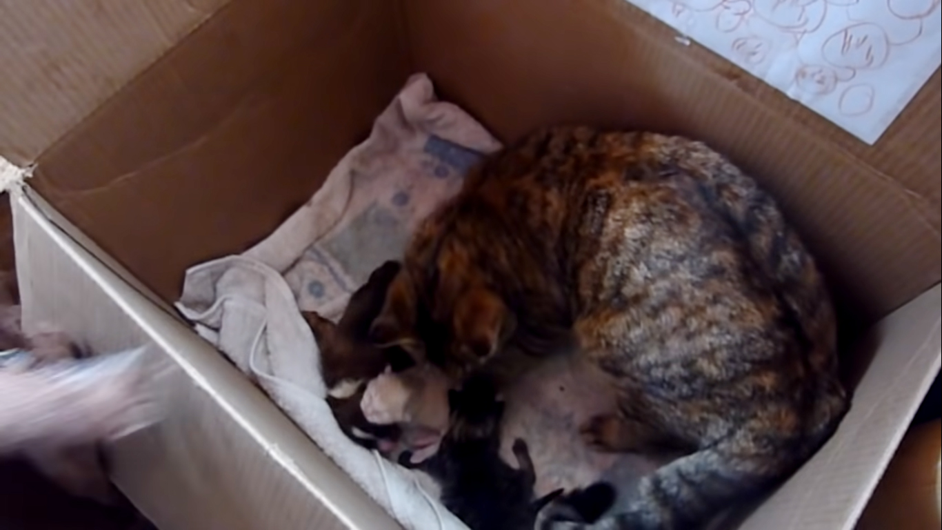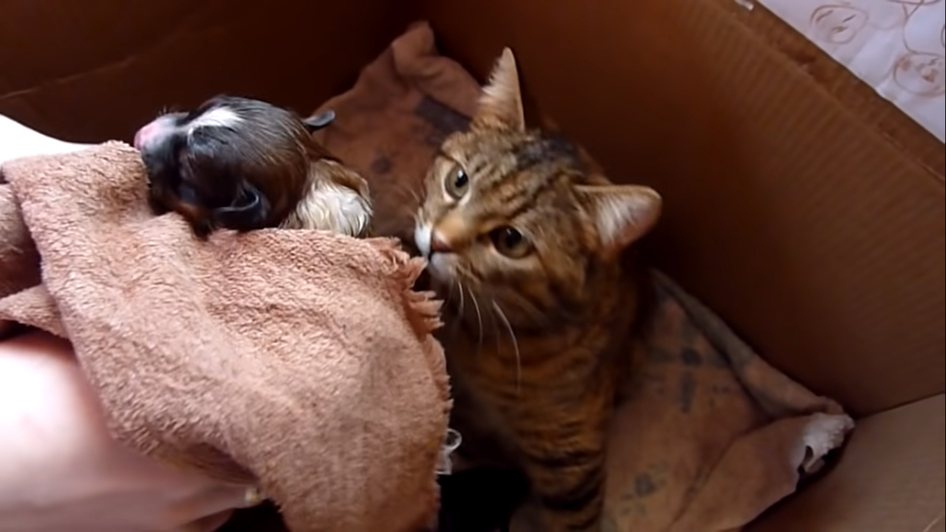 The puppy was still so small and wet as he showed up, which meant he just came out of mama’s belly not so long ago. A girl wrapped him in a blanket and brought him to the cardboard box where the mama cat was lying with her new kittens. As newborn babies couldn’t regulate their own body temperatures, it’s important to snuggle with their mommy during the first days of their lives. The girl didn’t place him into the box right away, instead, she chose to let them get to know each other first.