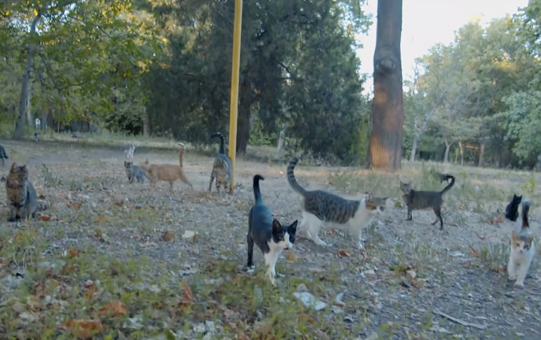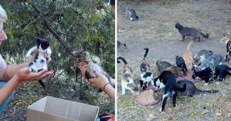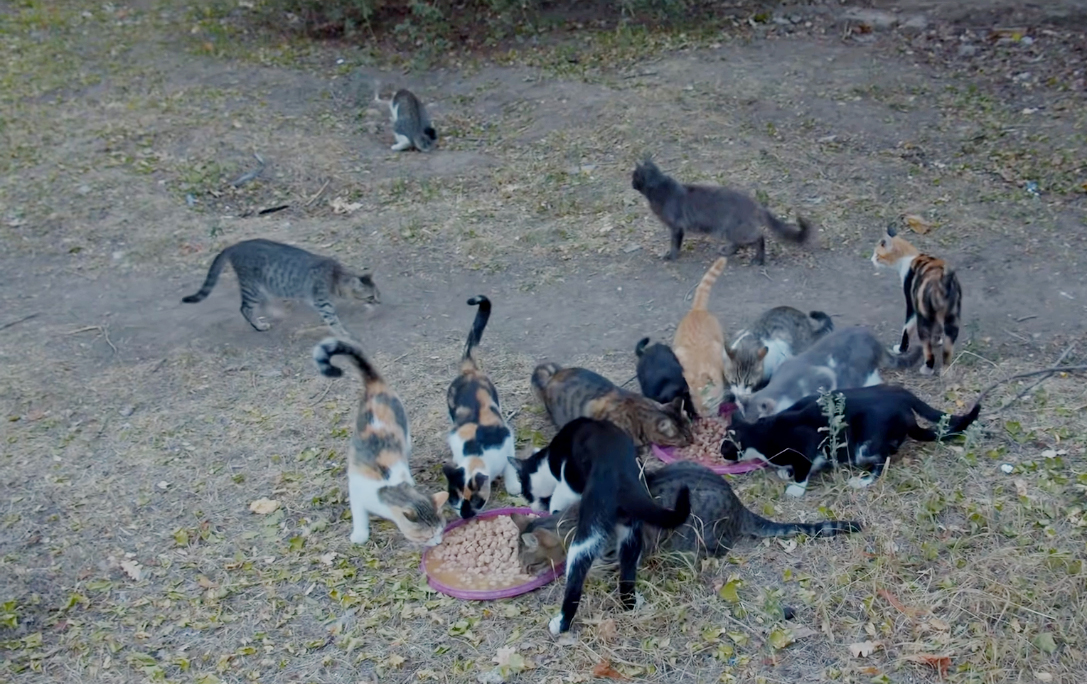 When the rescuers were about to bring them home, they noticed a few adult cats around the park. And once they started to call them, they were both taken by surprise as at least twenty more cats showed up at the same time!