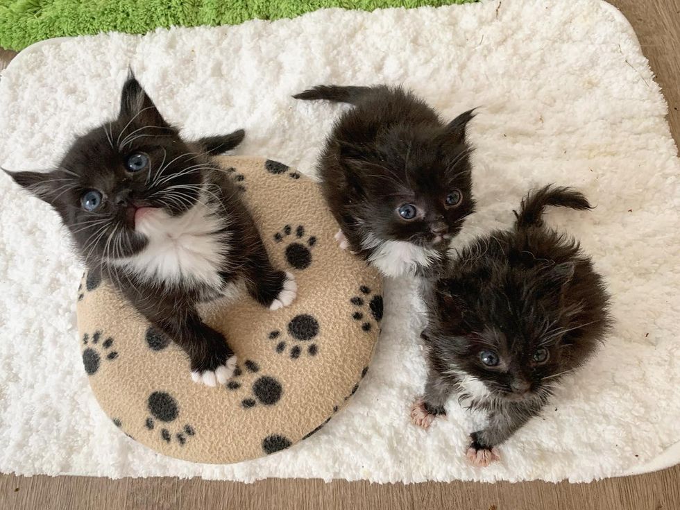 Knowing that Peep could benefit from having a friend, once she was medically clear, Sarah introduced her to a litter of younger kittens who happened to be tuxedos just like her.