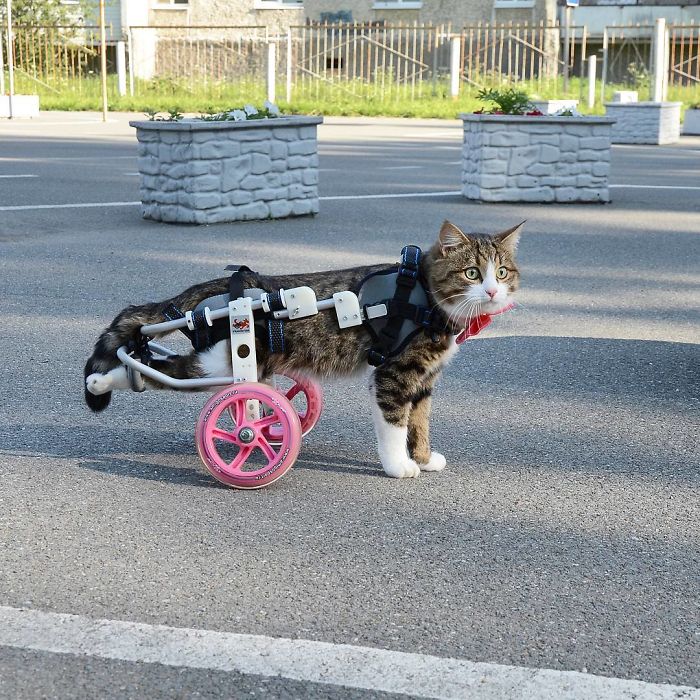 At first, Minaeva got her pet cat a custom wheelchair to help the creature get around the house. But it soon proved to be of little use. “He does way much better without [it.] Cats are very independent and adjust perfectly. Rexie is more mobile and comfortable walking and running on his two feet.”