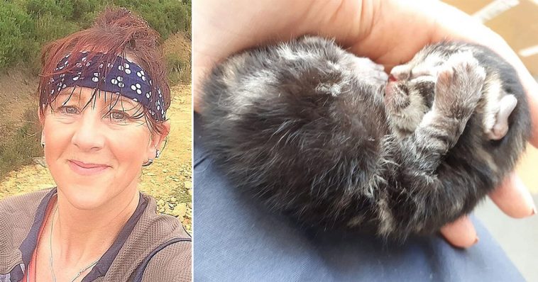Imagine her surprise when she saw a tiny newborn kitten, still with his eyes closed, lying on the ground. There way no way she was leaving this baby behind, so she scooped the kitten up and put him in her sports bra.
