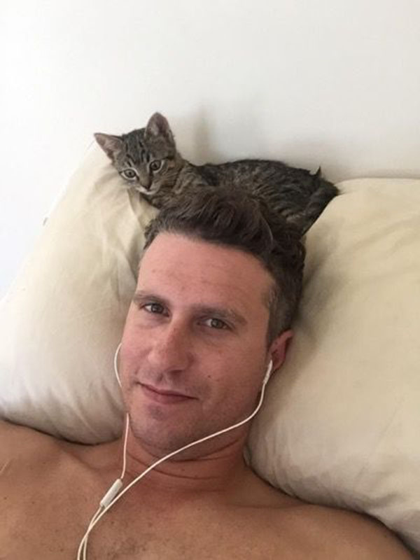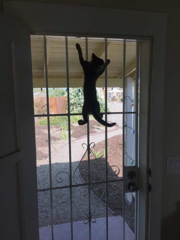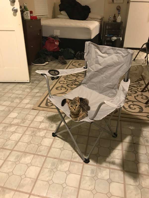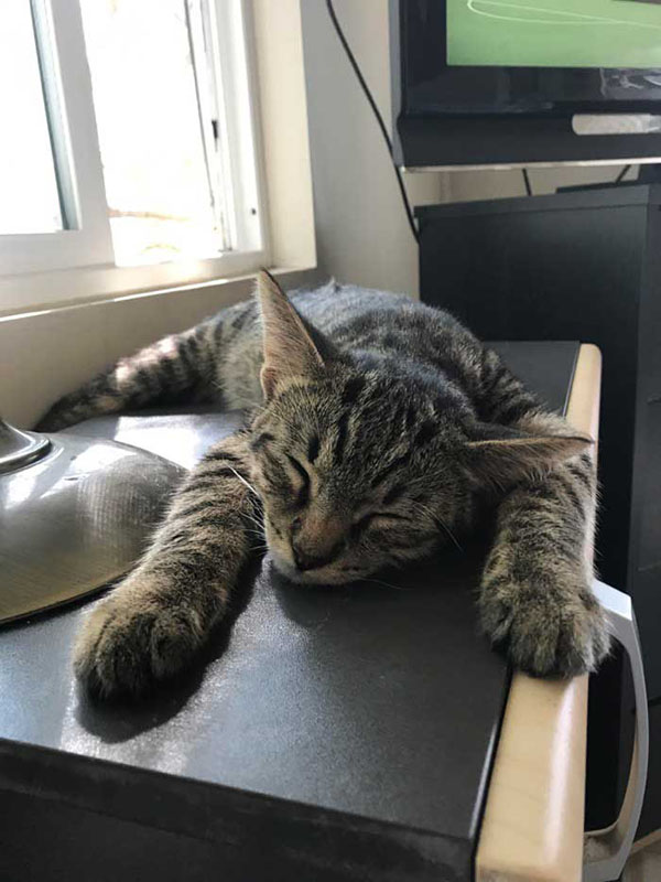“Gato immediately took to his new surroundings and sits on or around me whenever he needs a break from tearing around my place like a demon cat.”
