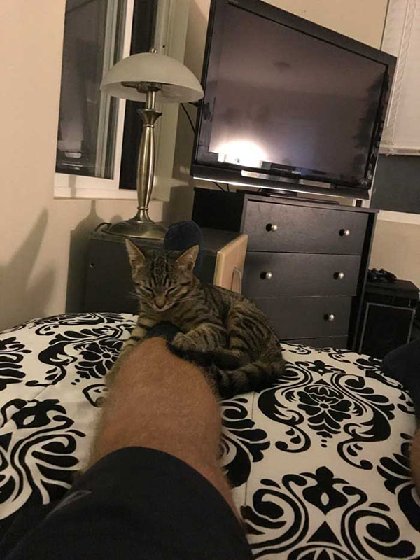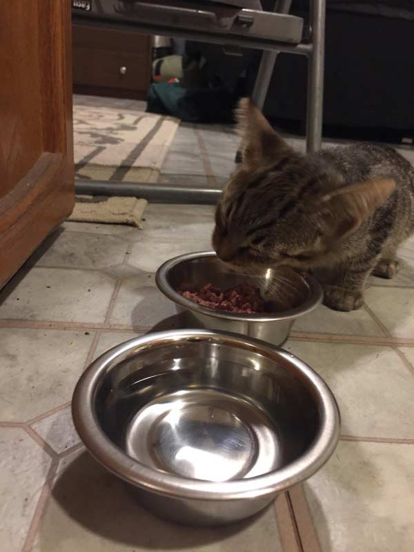 “He had no collar and was meowing like crazy. I decided he must be hungry so I ran to the store and got some kitty food and other supplies. Lil gato was so happy! He was meowing/purring as he ate.”