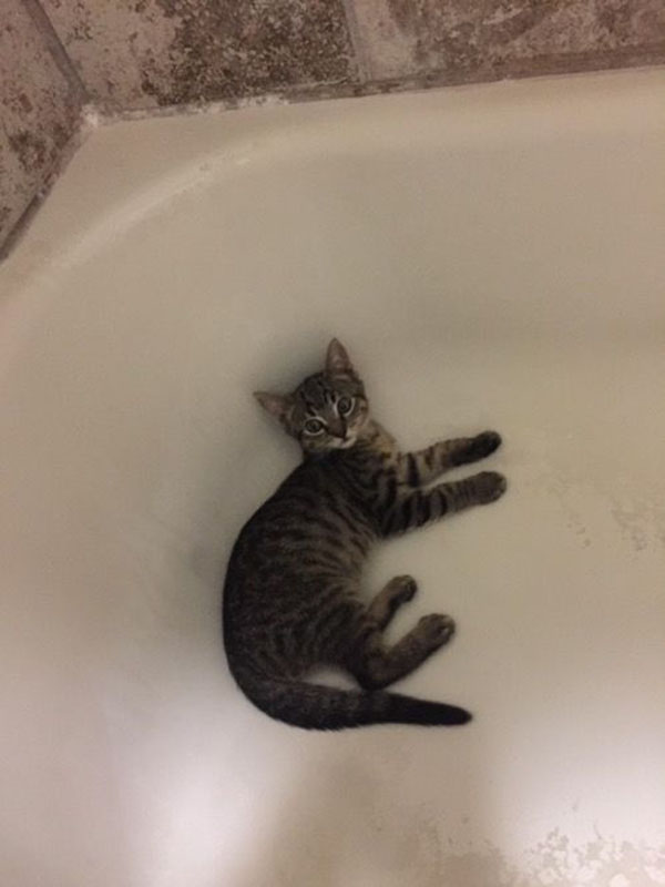He obviously feels right at home, as soon as he found the bathroom he leapt straight into the tub!