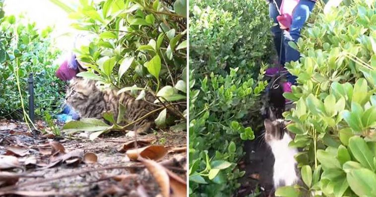 He was right. Two days later, they learned that there were three more cats staying nearby the area where they found the first cat. This time, they tied food into a string to patiently lure one of the kittens, a trick that they never used before. It was not easy at all but the smart rescuers managed to do it successfully. All of a sudden, the mama cat rushed out of the bush and tried to chase the rescue away. The rescue team was so surprised knowing that the mom was hiding there, and just showed up when she thought her baby was in danger. They saved the second kitty, but lost track of the mom and the other kitten, so they decided to come back later.