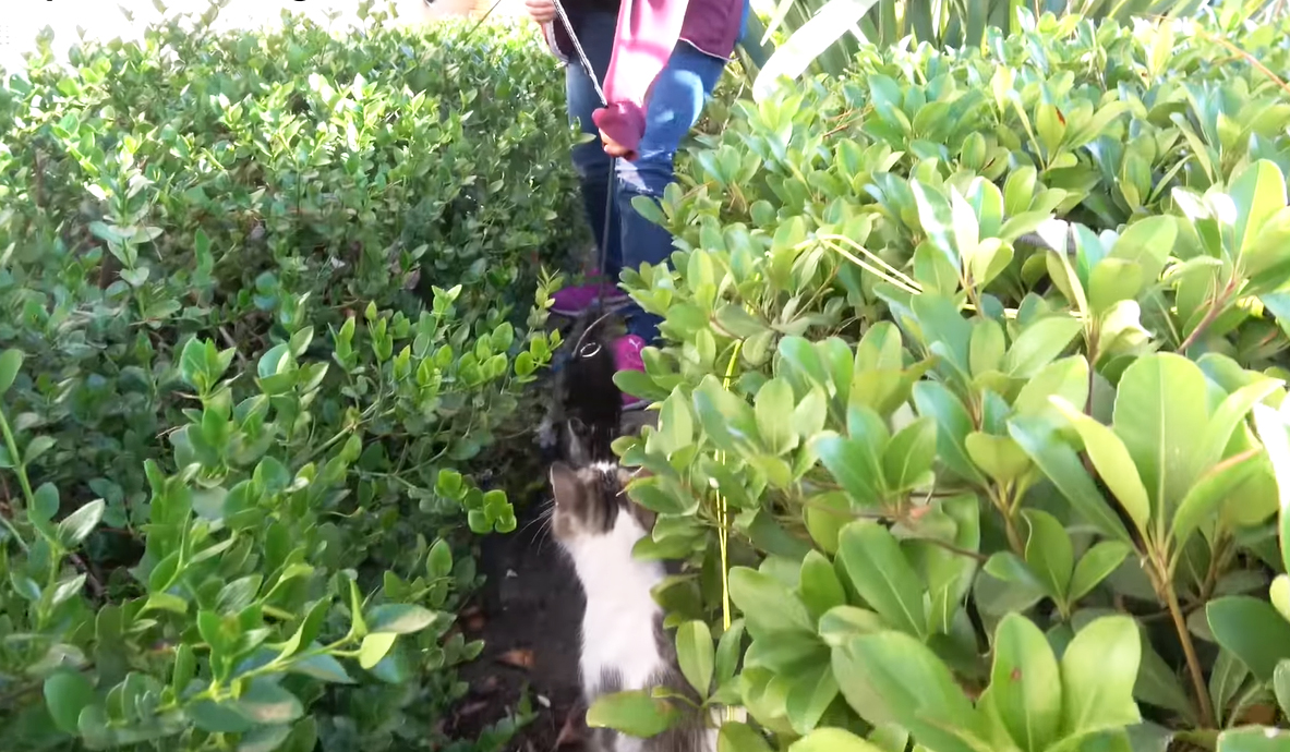 One of the rescuers headed over the area and looked around to find the cat. He spotted the kitten sitting behind the bush fence, then he tried to find a way to approach him without making any sound that might make the cat felt scared. Soon enough, he could save the cat easily. They started to take him to their shelter, but the rescuer had a hunch that the story was not over, there must be something more.