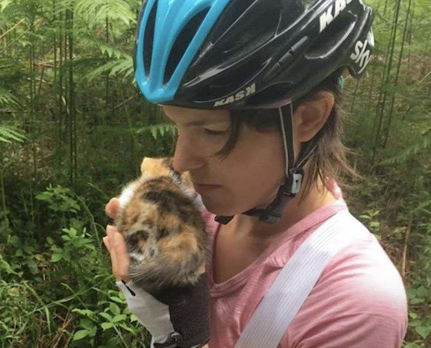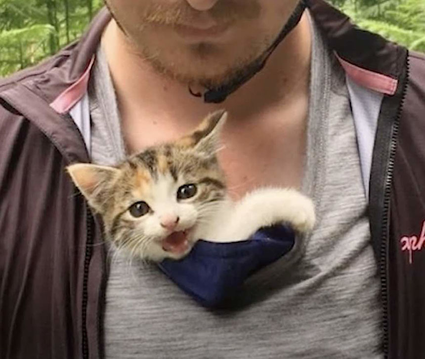 She climbed all over Celine and didn’t want to be put down. They now had to figure how they were going to get the little kitty home safely.