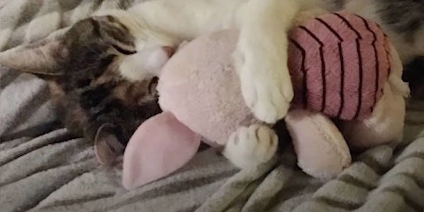 Today, Mini is still a huge cuddler and loves to snuggle up next to them. Even her pet Piglet gets lots of cuddles!