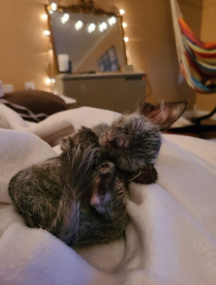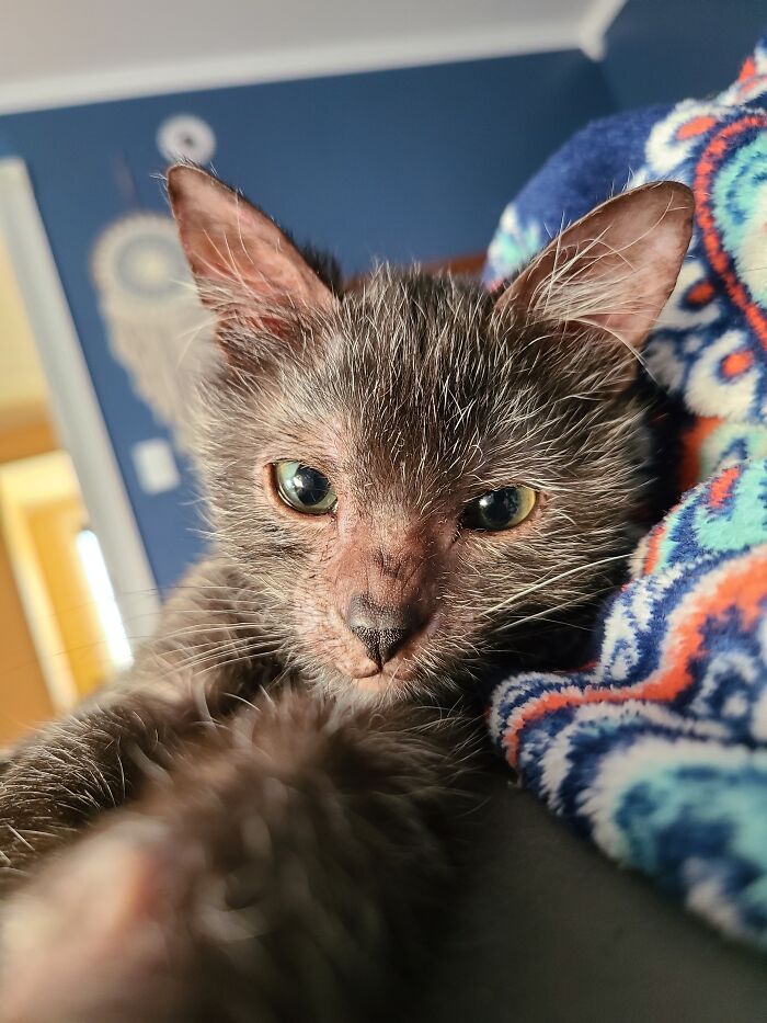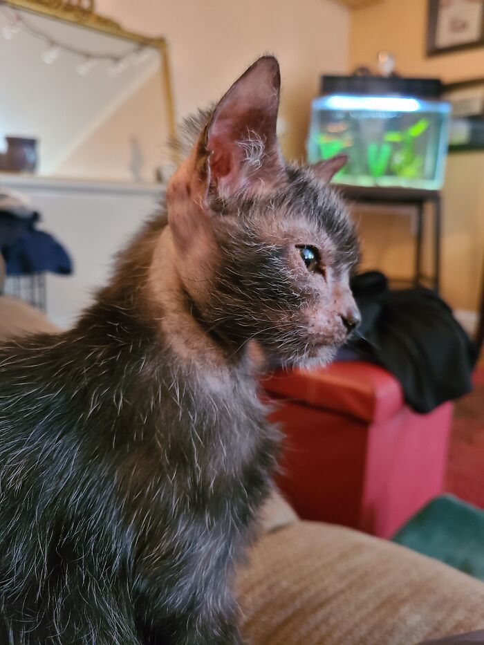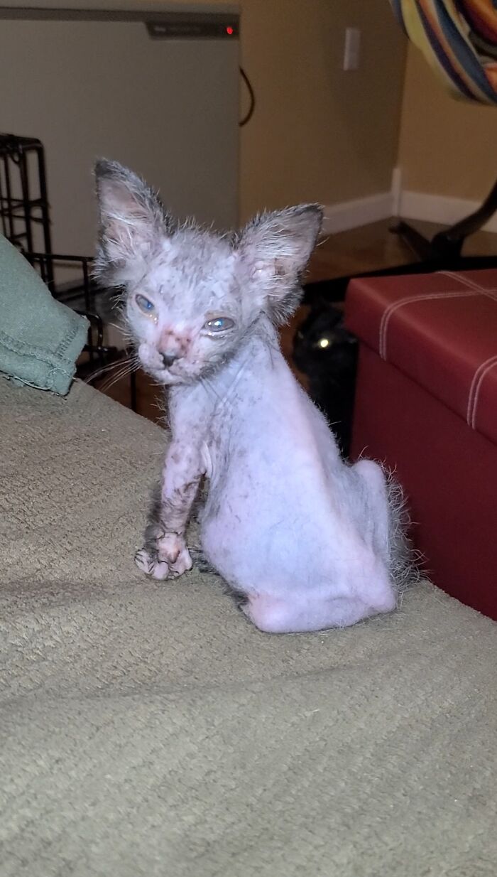 “She is just like every other house cat except she looks like a werewolf. After some research, I learned that she only had 1 coat of fur and would shed often throughout her life. I learned that she came as a natural genetic mutation from the feral colony her mom was part of.”